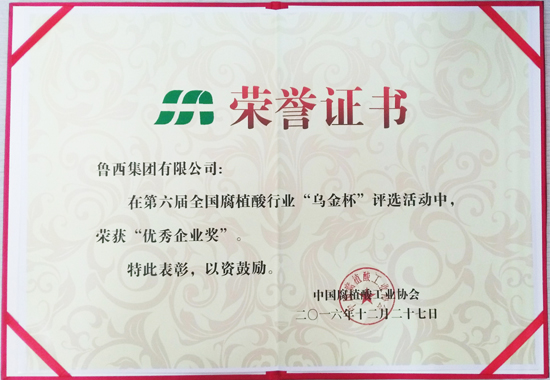 在會議同期舉行的中國腐植酸工業協會年度表彰會上,魯西集團有限公司憑借多年來大力開發、推廣腐植酸系列復合肥料,為實現傳統肥料產業升級做出的貢獻,榮獲第六屆全國腐植酸行業“烏金杯”優秀企業獎榮譽稱號。