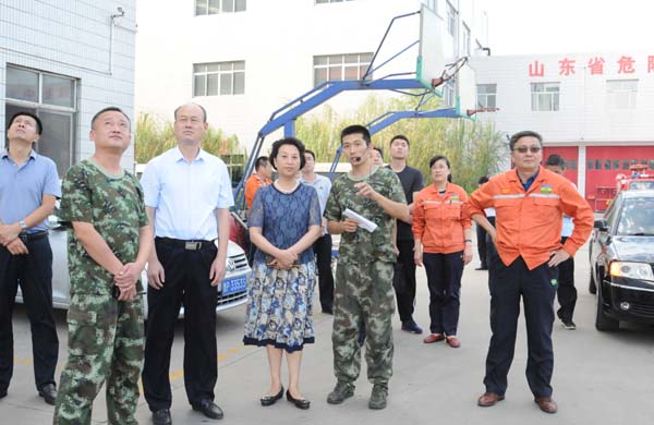 領導一行先后參觀了園區生產裝置、項目建設現場、應急救援中心、實訓基地、運行指揮中心和產品展廳。在應急救援中心,于娜政委實地了解了救援中心的營房建設、設施器材配備、應急救援指揮平臺建設等情況,并現場觀摩了隊員們的體能訓練、技術競賽科目演練,以及56米高空救援車和渦噴救援車的出水操作模擬演練情況。在運行指揮中心,領導們通過智慧化工園區平臺詳細了解了集團在安全、環保、消防應急、節能和電商物流等方面的智能信息化管控情況。