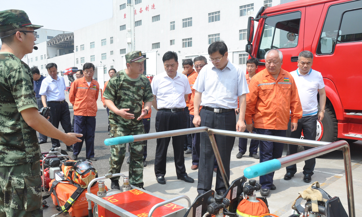 調(diào)研組領(lǐng)導(dǎo)先后參觀了園區(qū)生產(chǎn)裝置、重型裝備制作廠房、應(yīng)急救援中心,聽取了集團(tuán)在化工生產(chǎn)運(yùn)行、裝備制造、應(yīng)急救援隊(duì)伍建設(shè)方面的情況介紹,現(xiàn)場(chǎng)查看了消防救援裝備、遠(yuǎn)程平臺(tái)的配置管控情況,并對(duì)渦噴救援車噴水演練、隊(duì)員個(gè)人綜合體能訓(xùn)練情況進(jìn)行了現(xiàn)場(chǎng)觀摩。