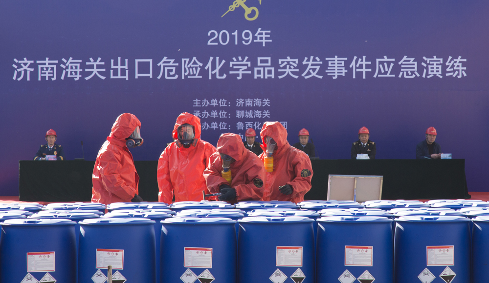 演練模擬事故為:聊城海關(guān)查驗(yàn)人員在現(xiàn)場(chǎng)查驗(yàn)魯西集團(tuán)出口的一批桶裝氯化芐過(guò)程中發(fā)現(xiàn)一桶泄露并有企業(yè)人員現(xiàn)場(chǎng)暈倒的情景。經(jīng)過(guò)裝置自救、魯西集團(tuán)應(yīng)急救援中心施救、聊城海關(guān)救援小組聯(lián)合對(duì)泄漏危險(xiǎn)品進(jìn)行有效成功處置,直至演練圓滿成功。