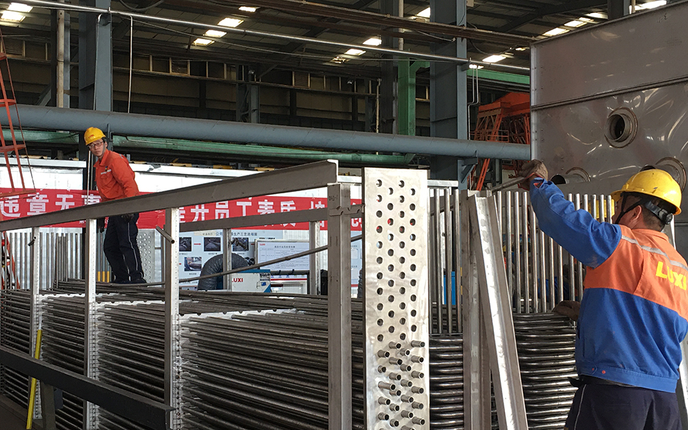 記者在廠房現場看到6臺制作完成的轉輪除濕二表冷設備,質檢科科長郭興強告訴記者:“這是為高端氟材料一體化項目制作的設備,計劃制作8臺,現已完成6臺。接到制作任務后,我們立即組織技術人員召開溝通會,與設計院進行溝通,出具詳細的圖紙。在確保工藝設備安全及性能的前提下,辨識可使用廢舊設備拆解的Φ25*2的不銹鋼管作為基管軋制翅片管。用廢舊換熱器拆除下來的換熱管經過修磨、除銹、酸洗、鈍化,每根換熱管經過內拋和外拋光兩道工序,逐根進行打壓,經過檢驗合格后,用作翅片管基管,庫存的鋁管料頭焊接成符合翅片管尺寸的鋁管,對鋁管進行軋制,制作二表冷設備需要的翅片管,通過實驗,軋制出的翅片滿足設計使用要求?!碑a品制作在保證質量和性能的前提下,優先考慮使用閑置及回收物資進行設備制作,提高了舊材料再利用率,降低了設備制作成本。