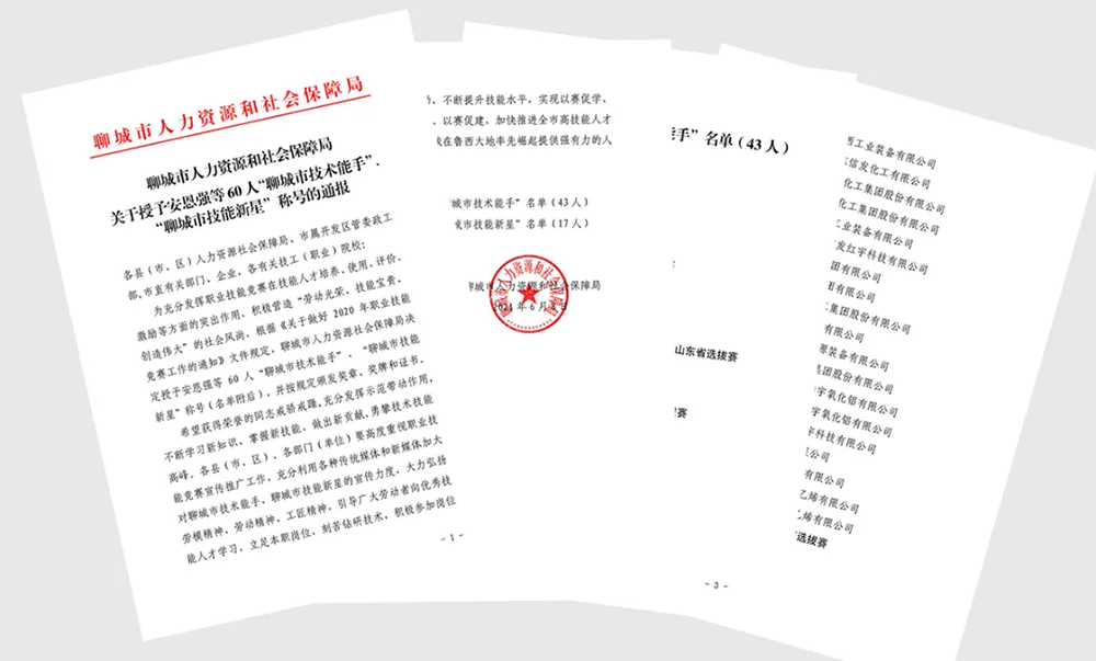 魯西集團陳娟、牟龍靜、唐文棟、李保路、衣后領、宋風庫、高慧蘭、王芳、鐘飛、王琳琳、亢肖彥、楊本宏、劉立振等13人因在第十一屆山東省化工行業(yè)職業(yè)技能大賽上取得優(yōu)異成績,于6月上旬被聊城市人力資源和社會保障局授予“聊城市技術能手”稱號。